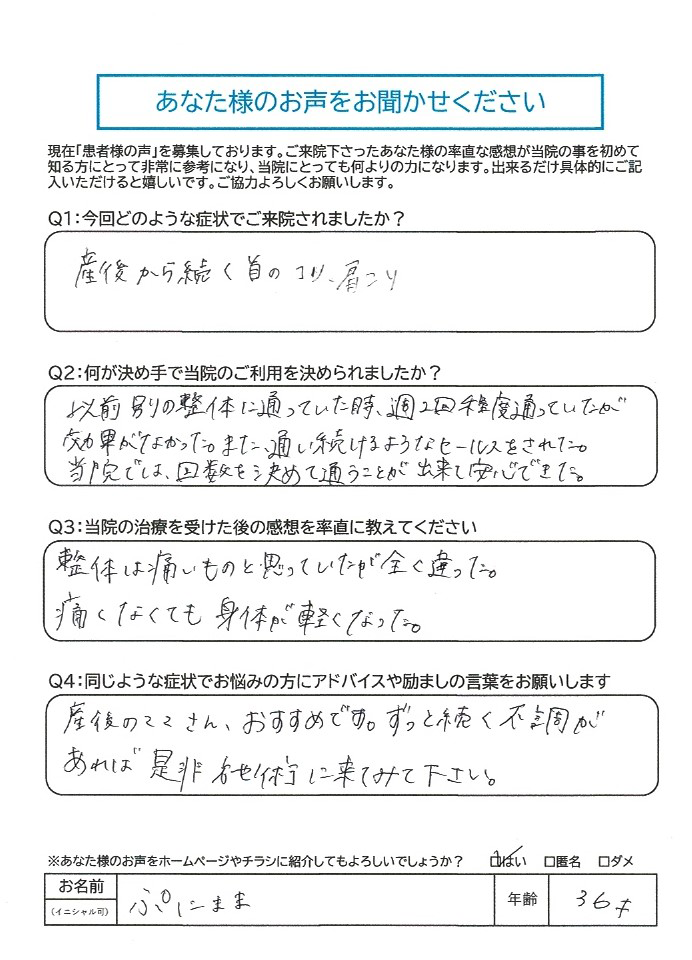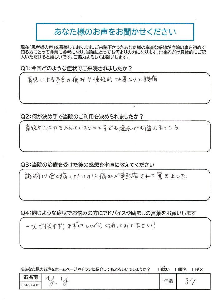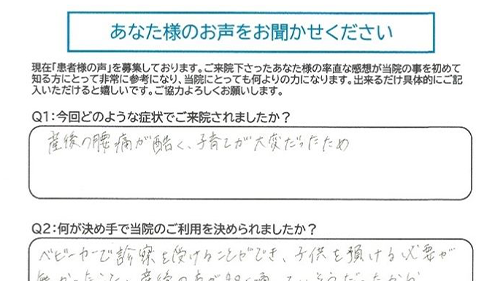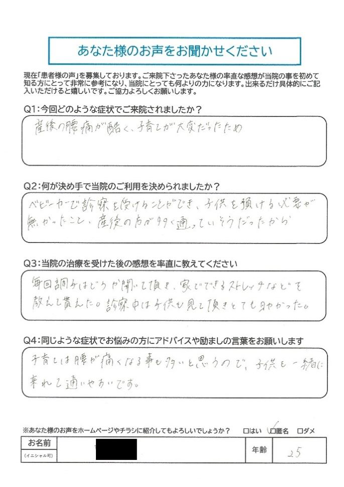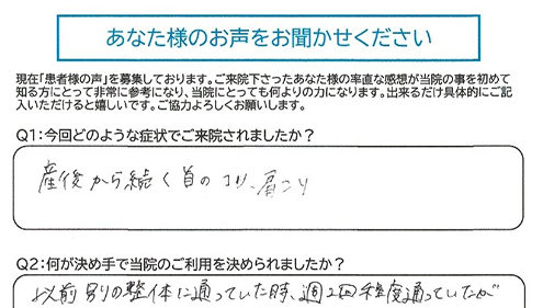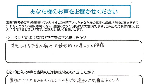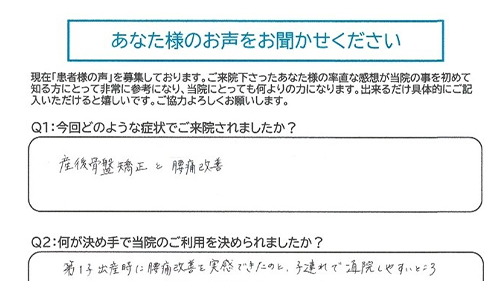 午前の11:00以降の時間なら患者さんも少なくなって、落ち着いて施術を受けられます。他の産後の方も来ているので安心してください